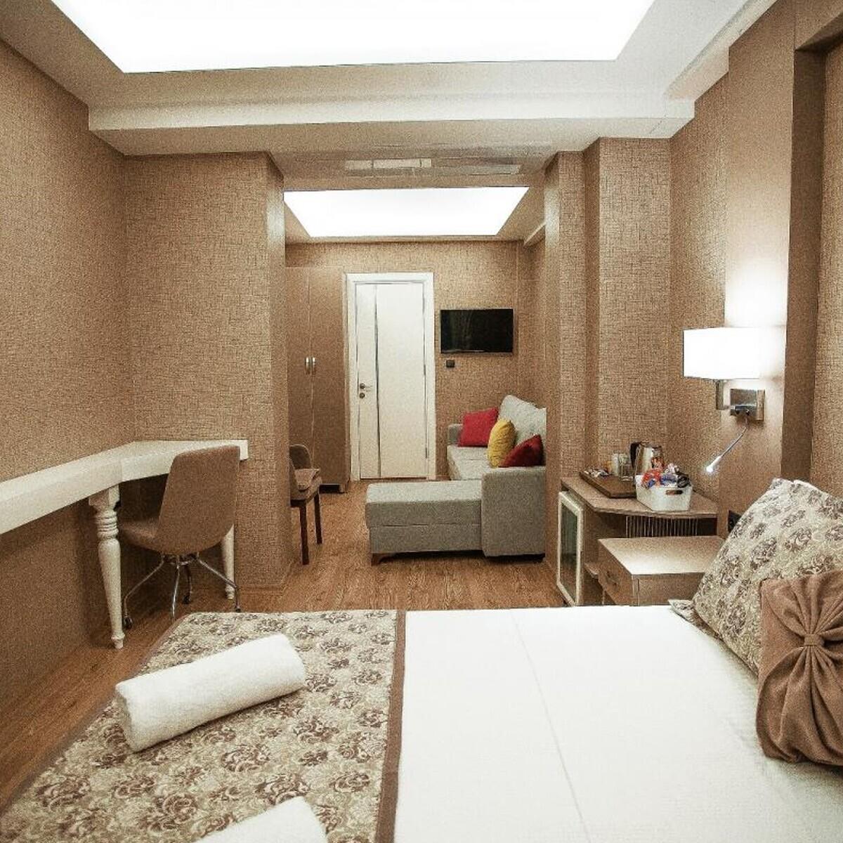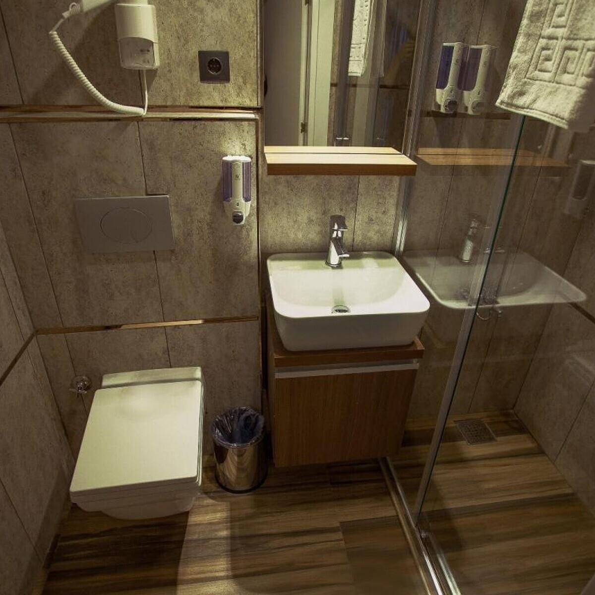 Modern oda donanımı: TV, banyo, duş, klima, oturma alanı ve ücretsiz Wi-Fi.