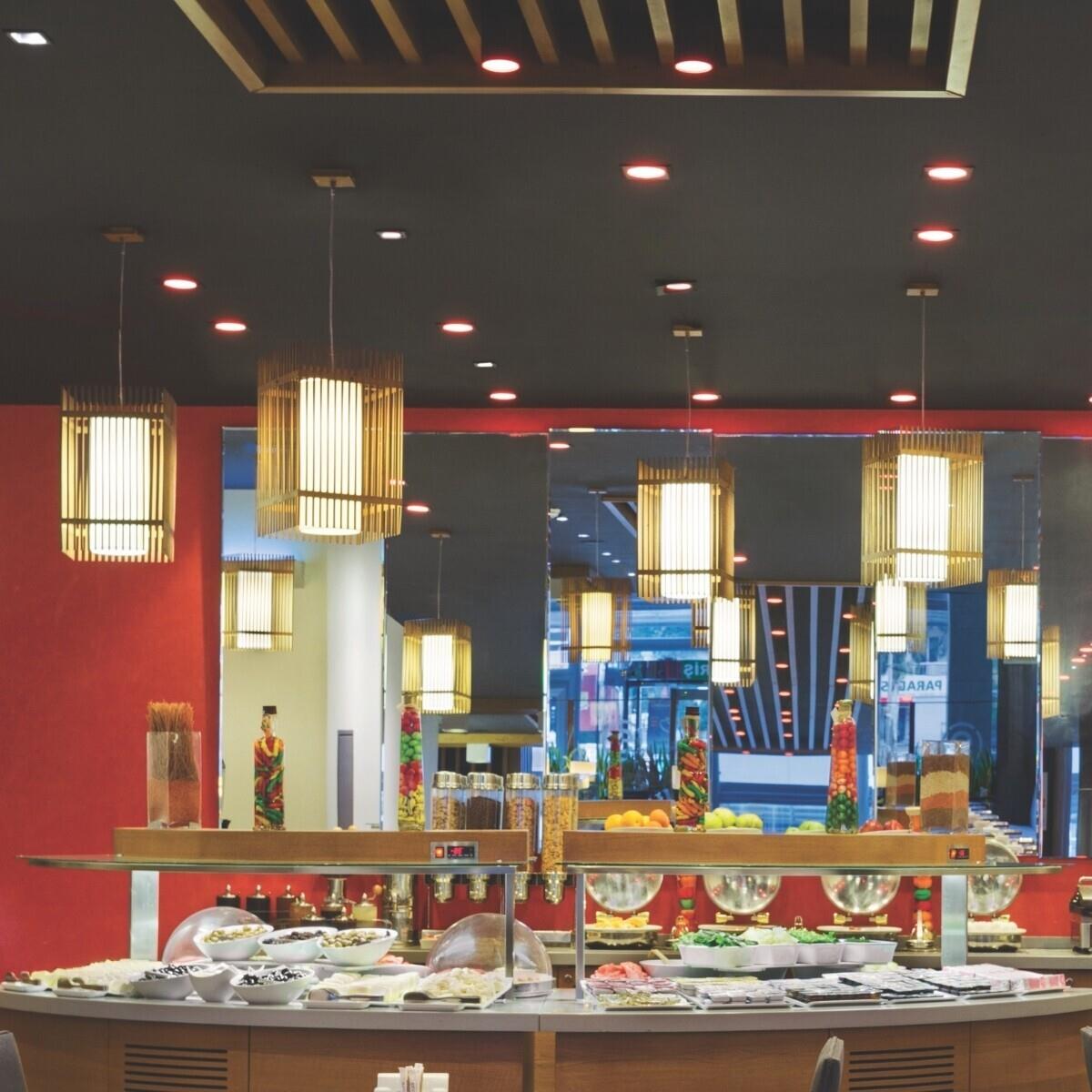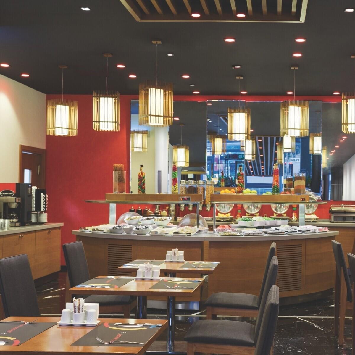 Zengin açık büfe kahvaltı: Ramada Encore İzmir’de taptaze ürünler ve sıcak-soğuk lezzetlerle dolu kahvaltı sofraları sizi bekliyor.