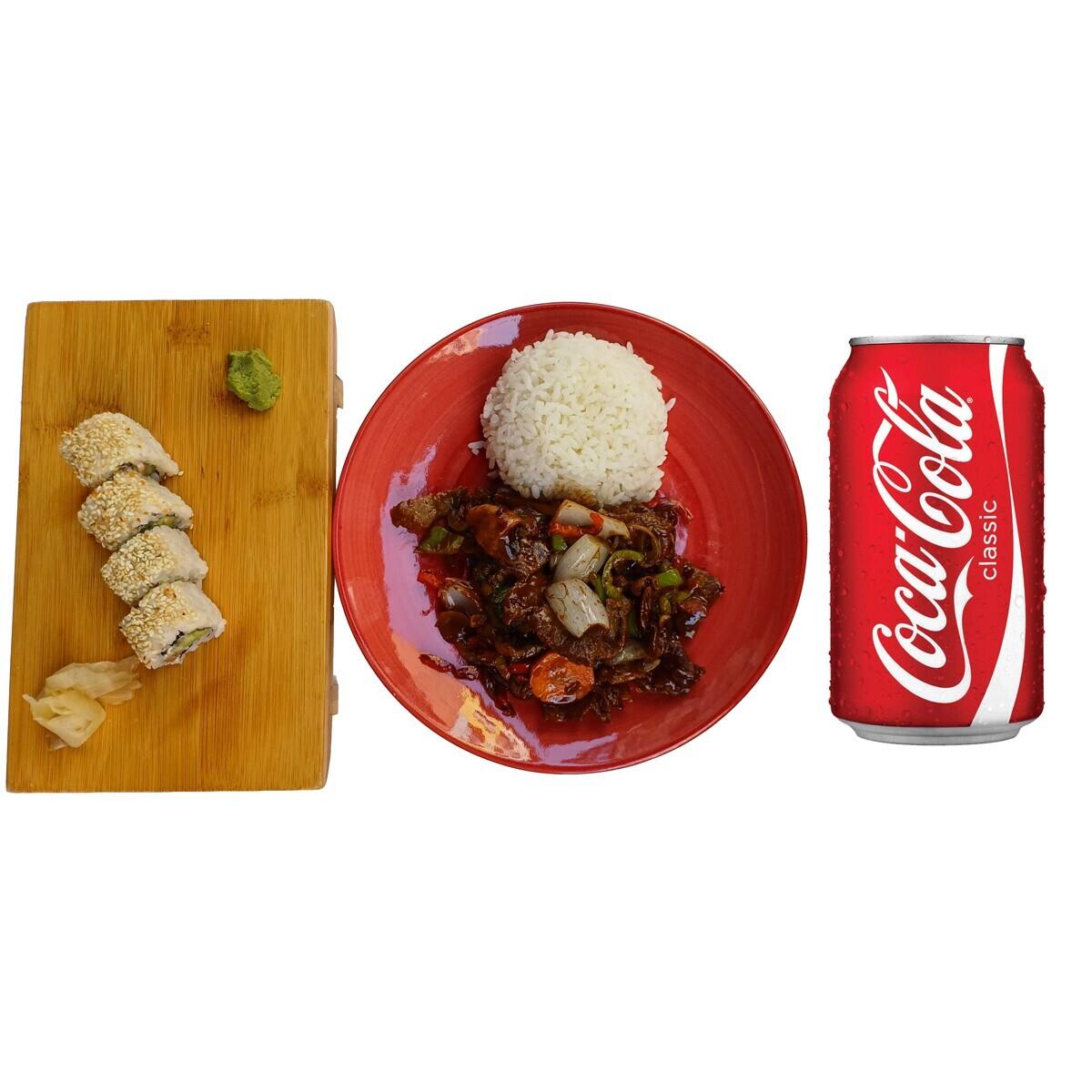 Mix Menü 5: Yarım Sebzeli Dana + Yarım Sade Pilav + 4 Adet Philadelphia Roll + Kutu İçecek