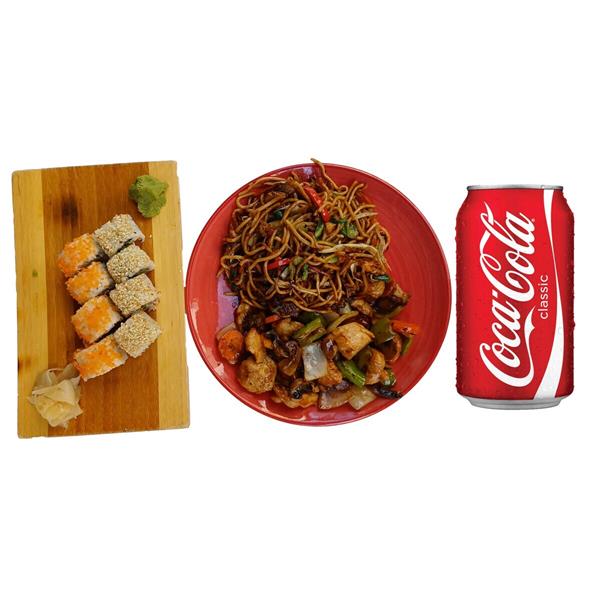Mix Menü 6: Yarım Mantarlı Tavuk + Yarım Sebzeli Noodle + 4 California + 4 Philadelphia Roll + Kutu İçecek
